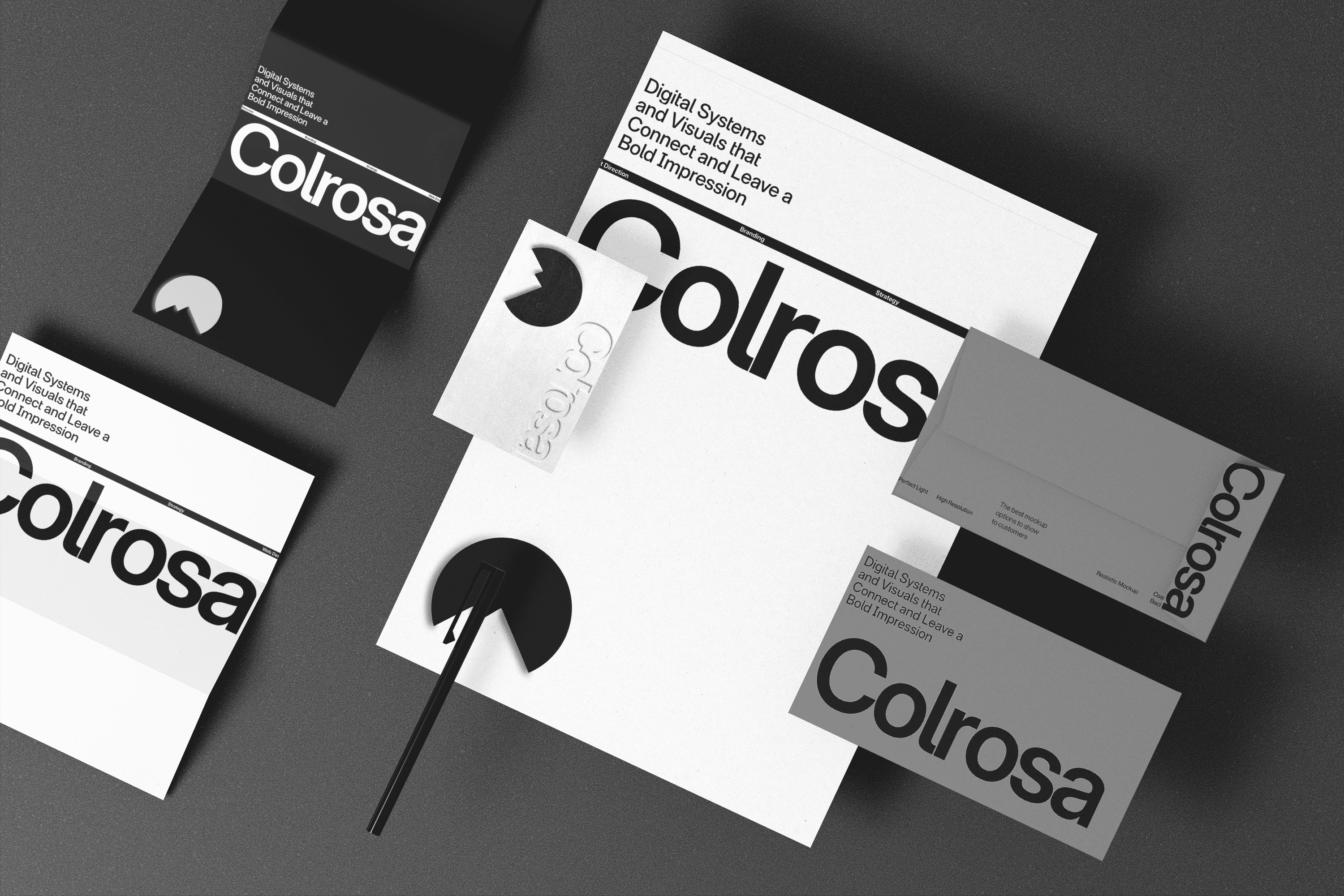 Colrosa’s identity was developed as a study in contrast and control. The circular summit mark anchors the brand, balancing geometric precision with a sharp, deliberate break that signals elevation and momentum. From there, the typography does the heavy lifting. Bold, oversized wordmarks stretch across layouts with confidence, often cropped or rotated, creating tension and scale rather than safe, centered compositions. The black and white palette was chosen intentionally to remove distraction and amplify structure, allowing light, shadow, texture, and material to carry emotional weight. Across print, packaging, editorial spreads, tape applications, and digital screens, the identity behaves consistently but never passively. It flexes. It wraps. It dominates negative space. Every asset, from embossed cards to full-bleed editorial layouts, reinforces the same principle: Colrosa is a disciplined, high-contrast creative system built to command attention in both physical and digital environments without relying on noise.